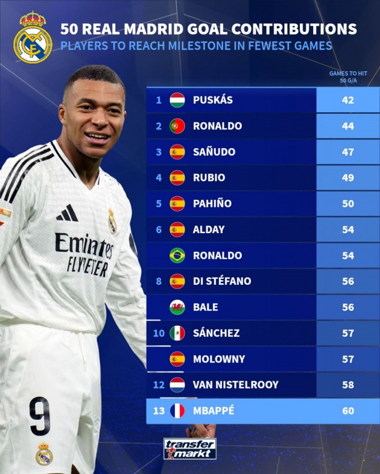 8月21日讯 德国转会市场统计了皇马球员参与50粒进球所需的场次,并列出最快参与50球榜单,普斯卡什42场居首,C罗44场次席,姆巴佩60场排名第13位。