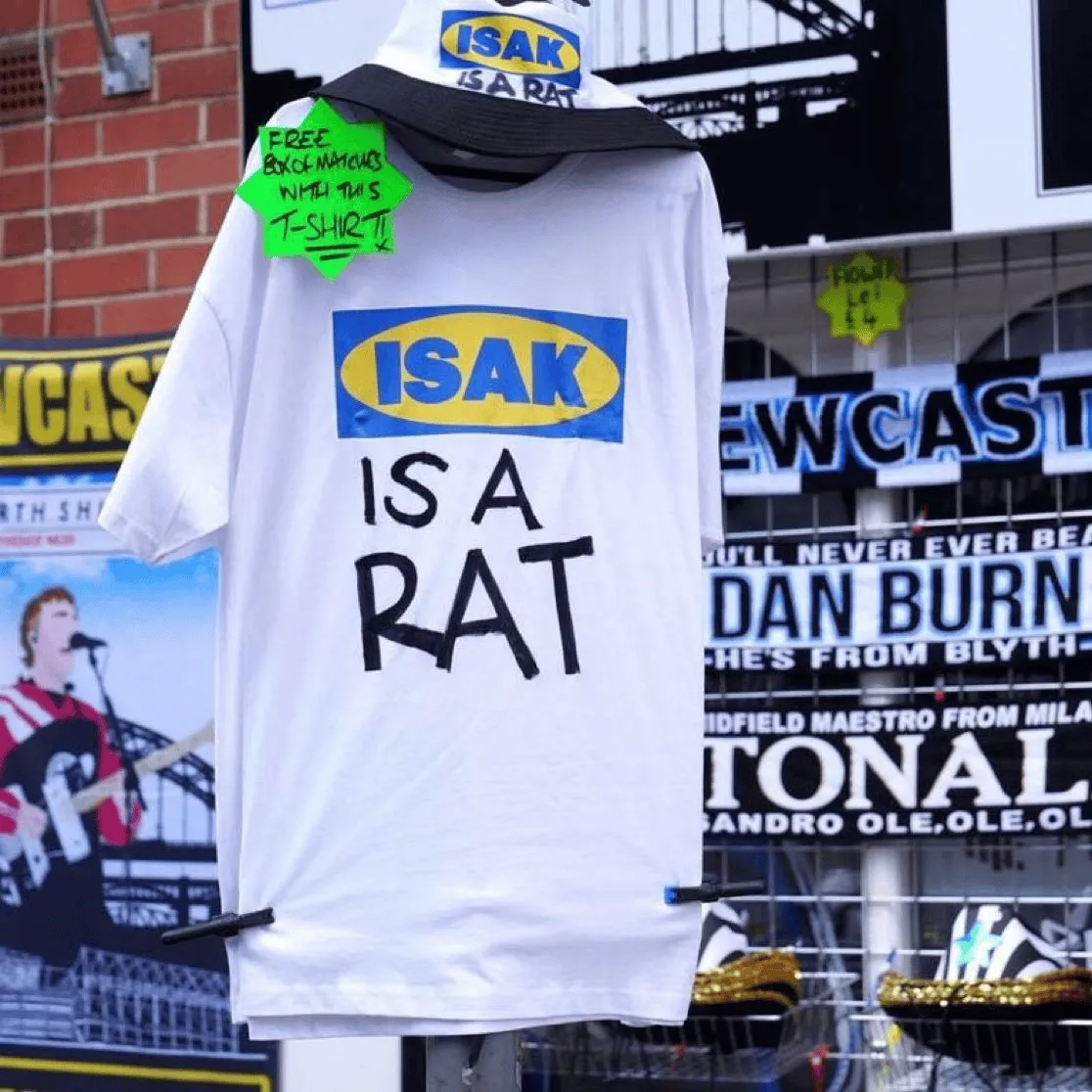 赛前,圣詹姆斯公园球场外有人出售特制的T恤衫,上面印有“伊萨克是老鼠”的字样。